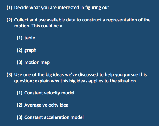I’ve borrowed a lot of this from you modelers out there… you know who you are. And I don’t think these directions are necessarily linear, although maybe I do think that representing the situation early makes more sense, because it guides you to what models or ideas might be useful. I also think the average velocity idea is one of the most important ideas about there, even though I’m not sure it’s a model. Of course, sometimes representing or applying models will lead you to new questions. And asking if a model applies is a question itself. And sometimes you can jump to (3) pretty quickly and end up needing a representation to be your abacus. But the gist is this: Be interested in something, construct representations that will let you see that interesting thing a new way, apply ideas and try to break models. So maybe that’s what the directions should be.