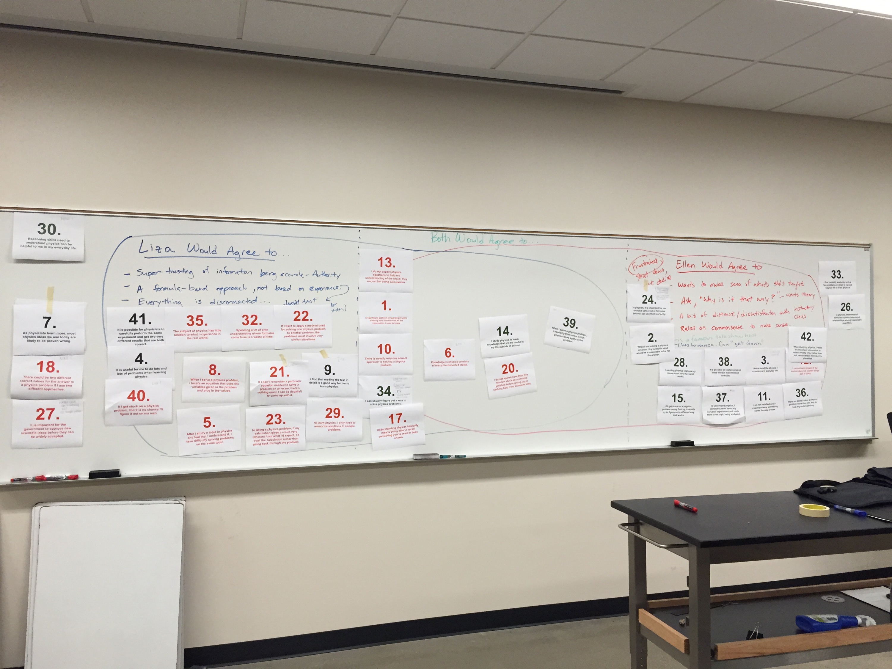 For the LA seminar class on student attitudes about and approaches toward science learning , I ended up color-coding the statements from the CLASS, according to expert concensus: Green for agree, red for disagree, and black for no concensus. I didn’t tell them what the colors meant as they sorted them. To a really good measure, the favorable statements ended up being attributed to Ellen’s approach and the unfavorable responses attributed to Liza’s approach. This is what I expected would happen, and when I revealed what colors meant, it gave us the opportunity to talk about what we’d done and found in a new light.