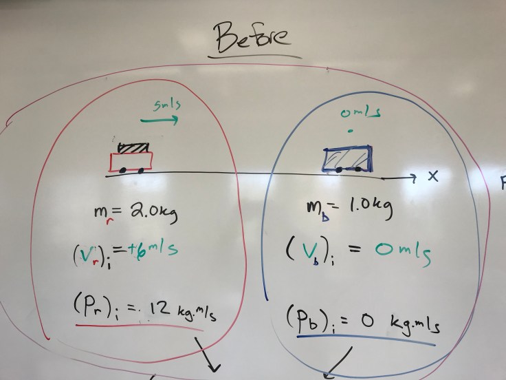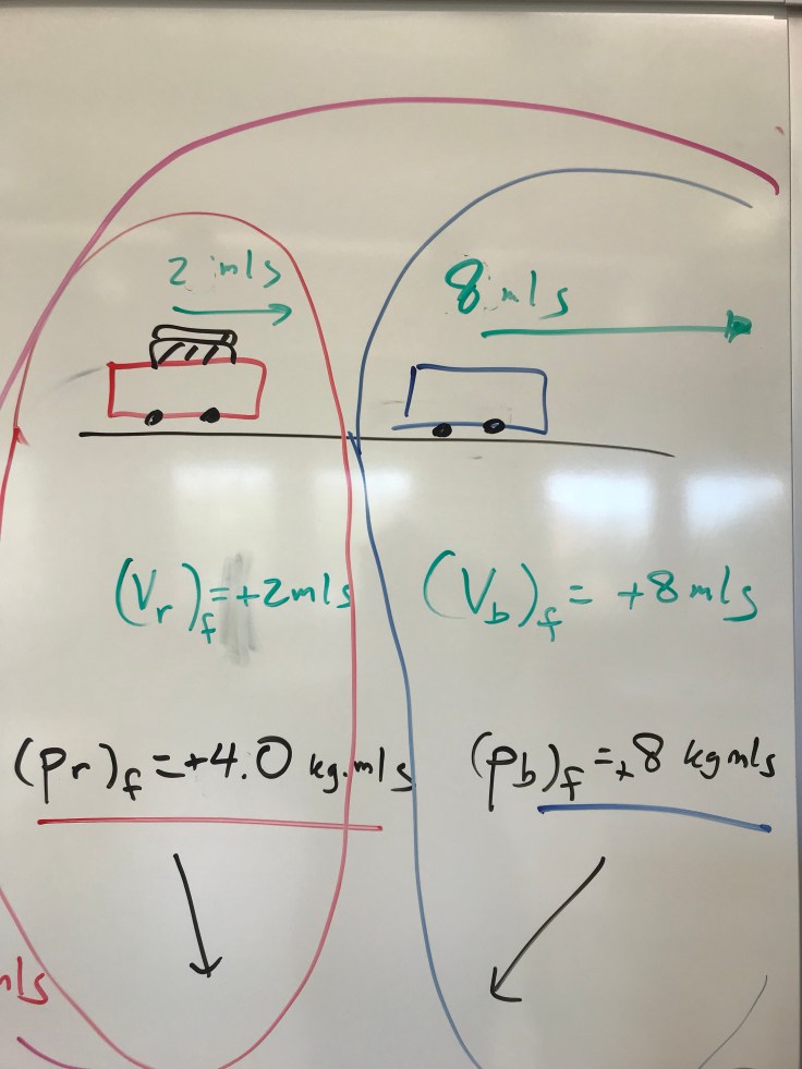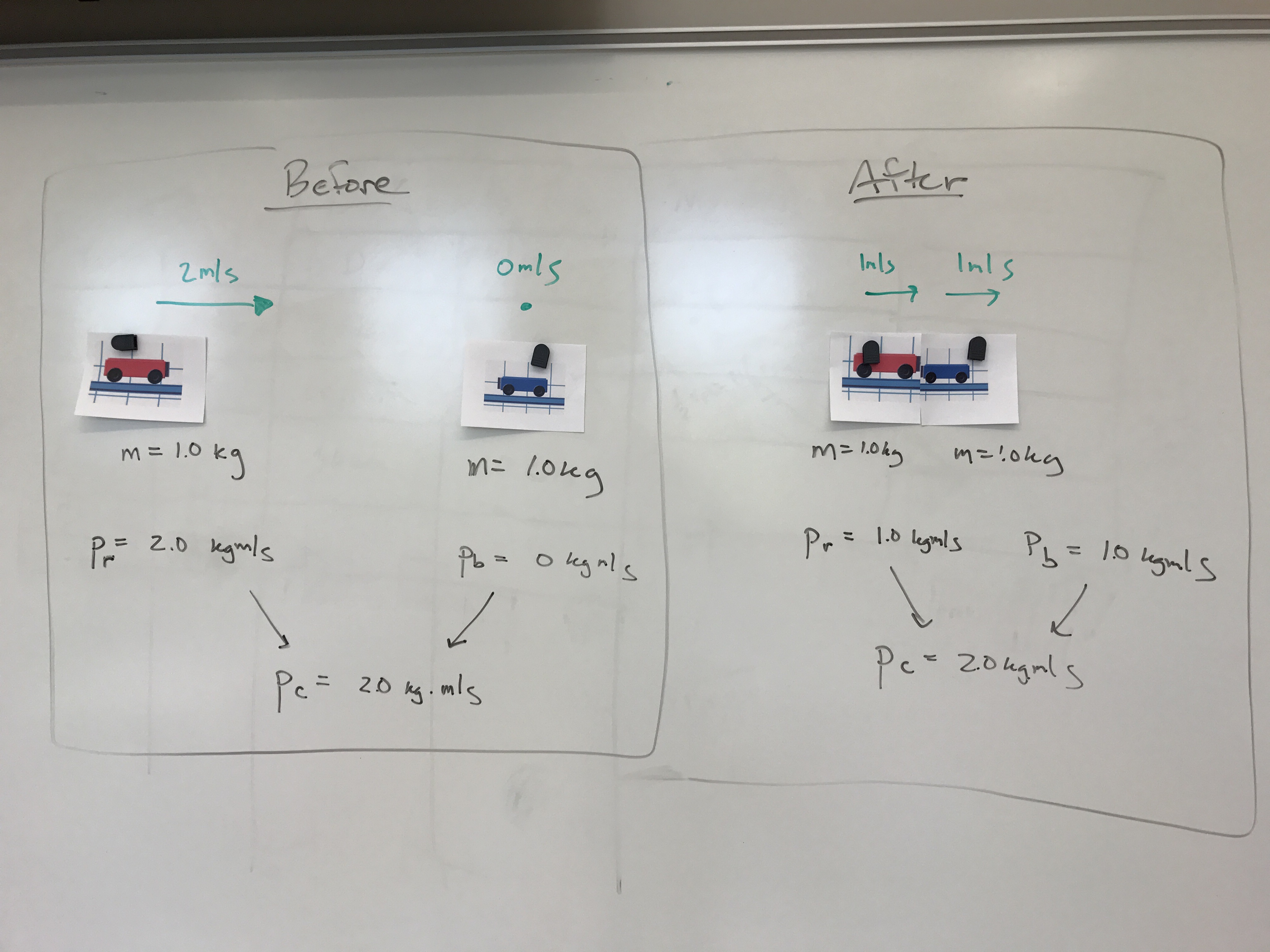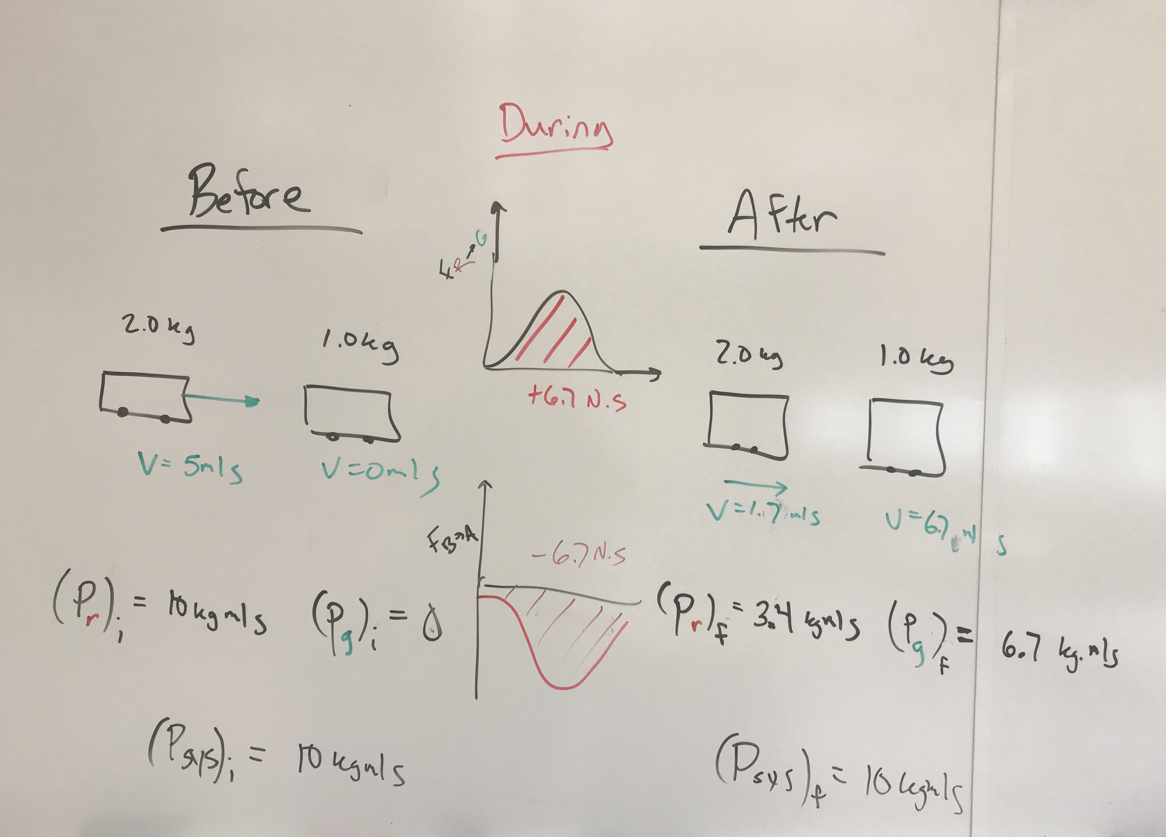 Finally we look at Inelastic collisions, and this is the first time students use momentum conservation to make predictions. Studnets predict final velocity, but then must also determine how much momentum was transferred. Doing so involved practice shifting perspective, from system to individual objects.