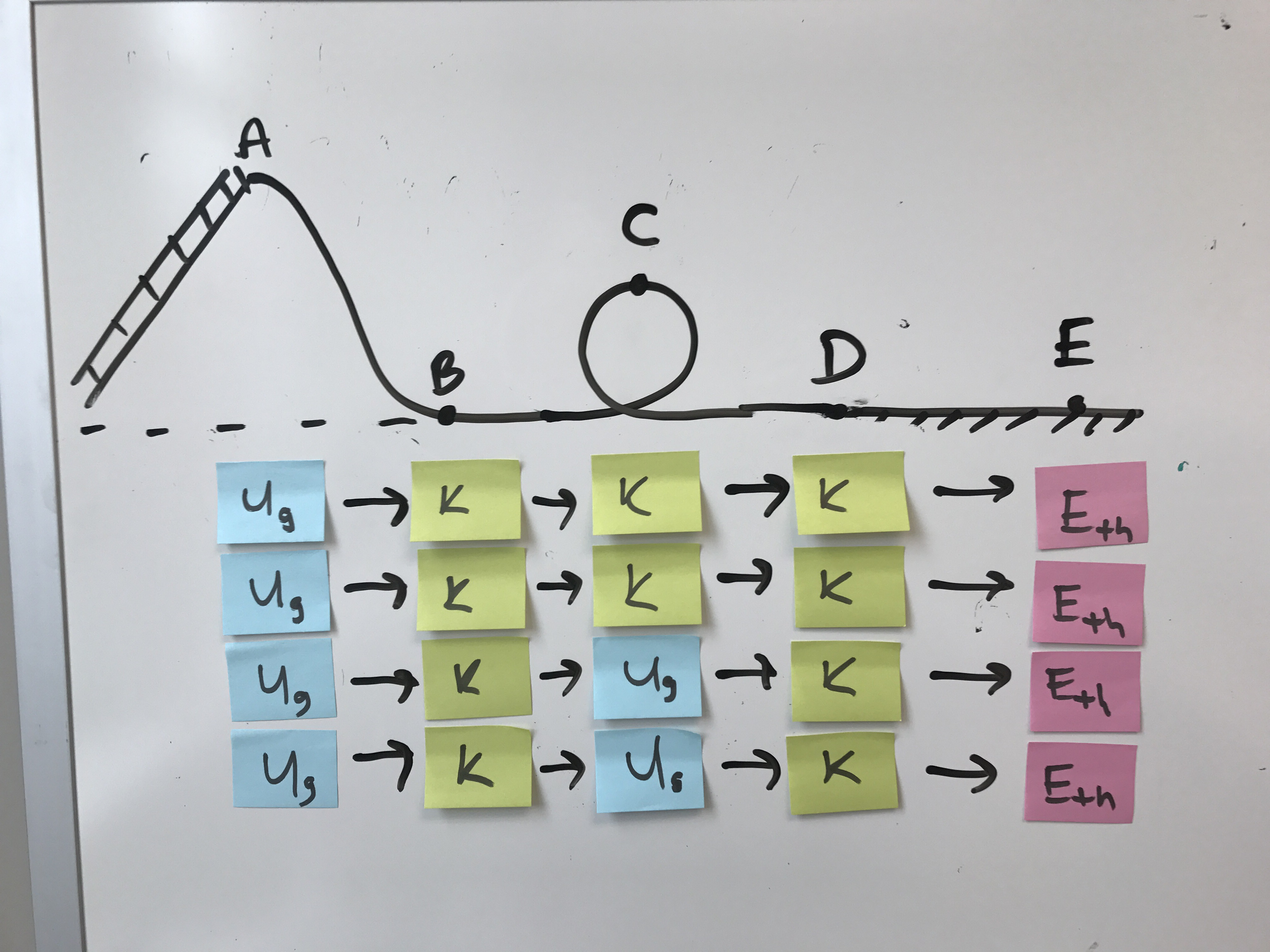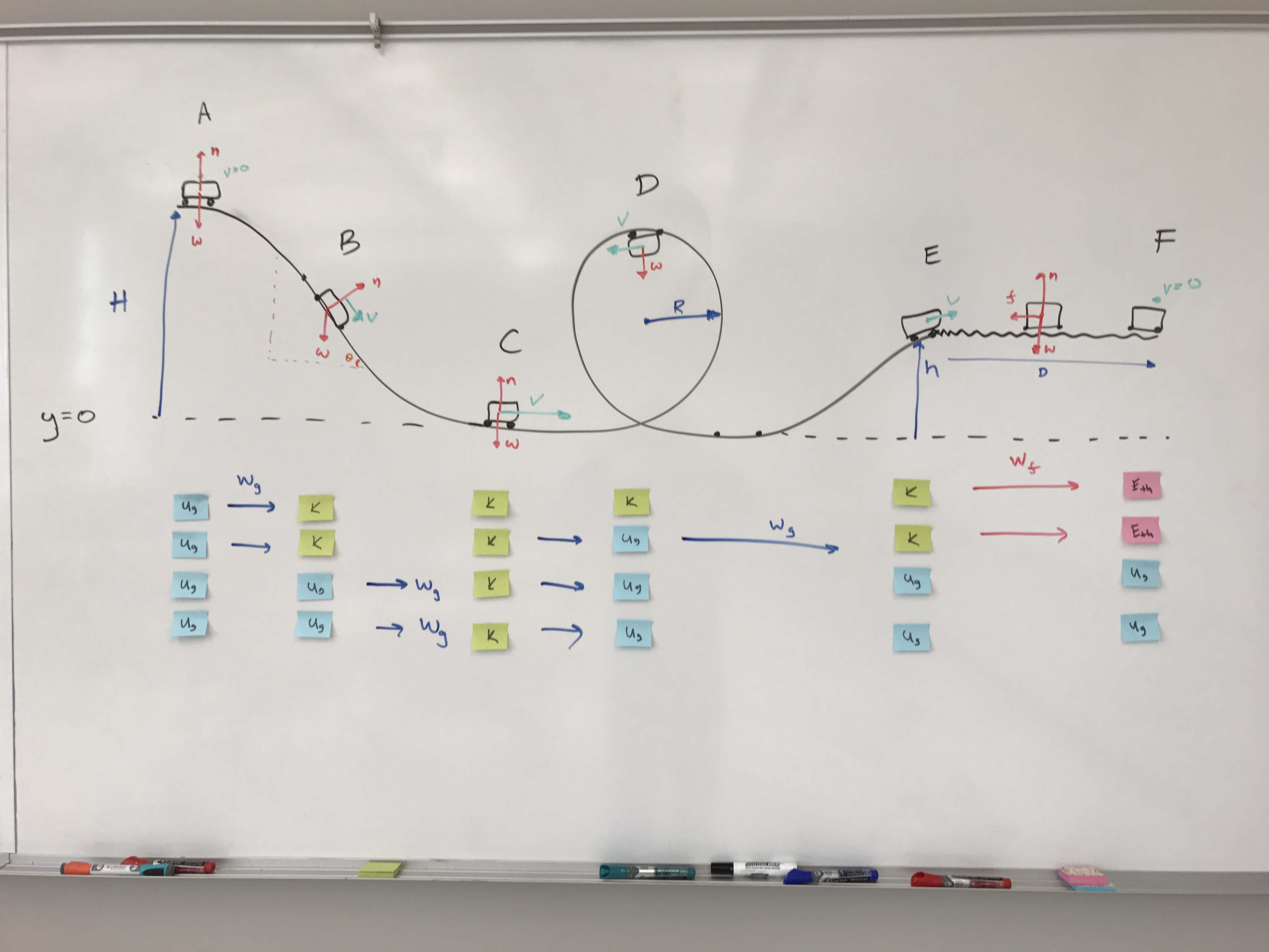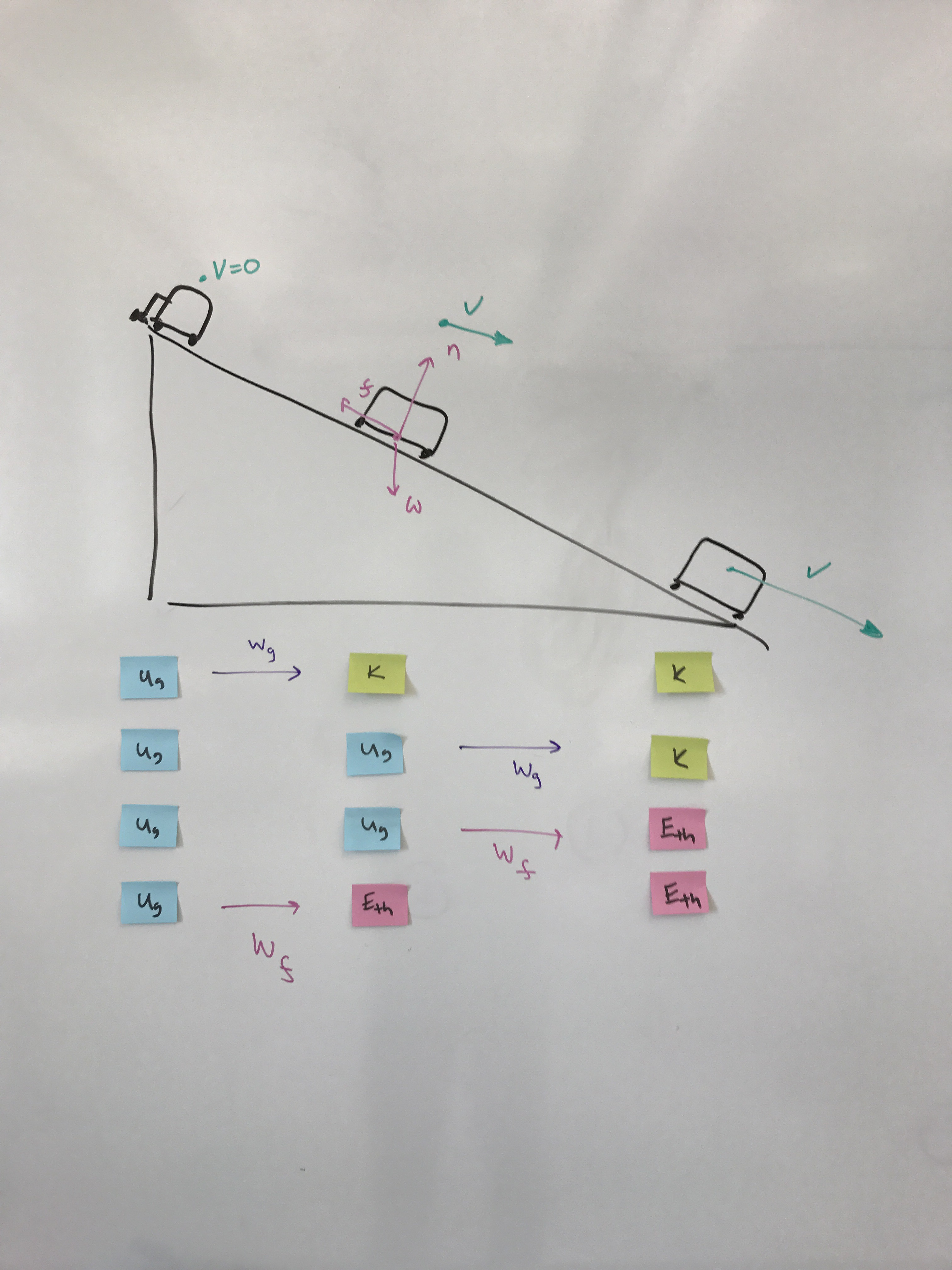 Finally we look at Inelastic collisions, and this is the first time students use momentum conservation to make predictions. Studnets predict final velocity, but then must also determine how much momentum was transferred. Doing so involved practice shifting perspective, from system to individual objects.